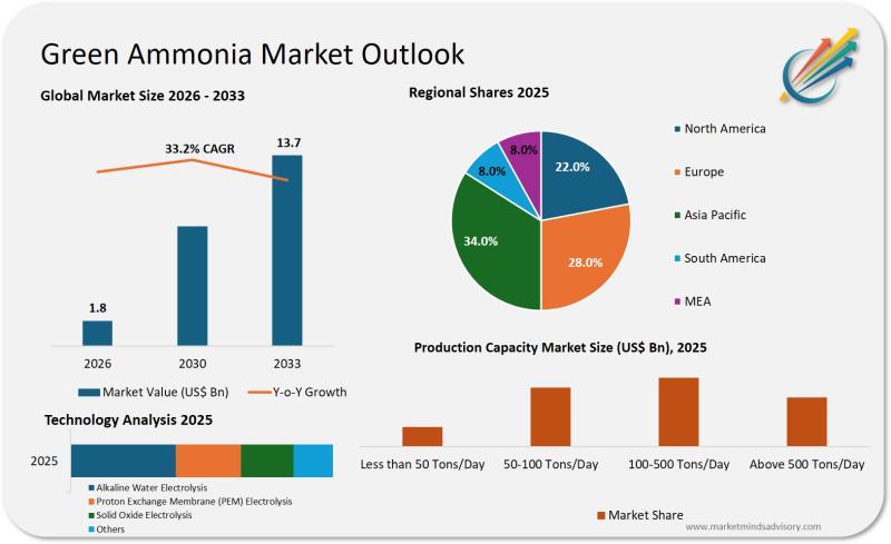 The green ammonia market is positioned at a pivotal juncture, with a projected expansion from USD 1.8 billion in 2026 to USD 13.7 billion by 2033, according to Market Minds Advisory. This rapid growth trajectory is underpinned by the convergence of decarbonization mandates, advancements in electrolysis technology, and increasing integration of renewable energy sources. Green ammonia, produced using hydrogen derived from renewable electricity, is gaining traction as…