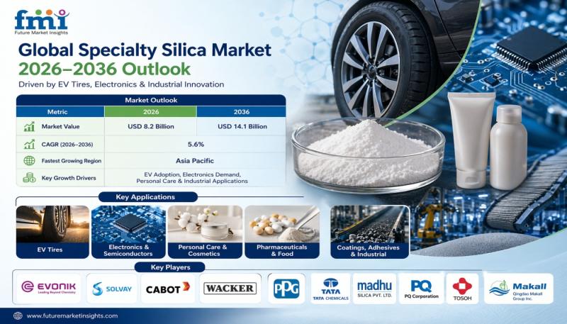 The global Specialty Silica Market is entering a sustained growth phase, with market value projected to rise from USD 8.2 billion in 2026 to USD 14.1 billion by 2036, reflecting a CAGR of 5.6% during the forecast period. Demand is being shaped by rapid advancements in mobility, electronics manufacturing, personal care formulations, and precision industrial processing.