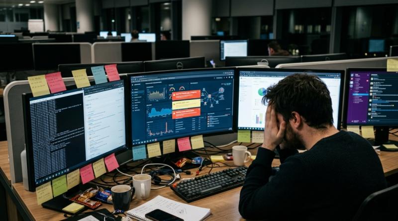 Stressed security analyst overwhelmed by alerts across multiple monitors, illustrating the 80 tools crisis.