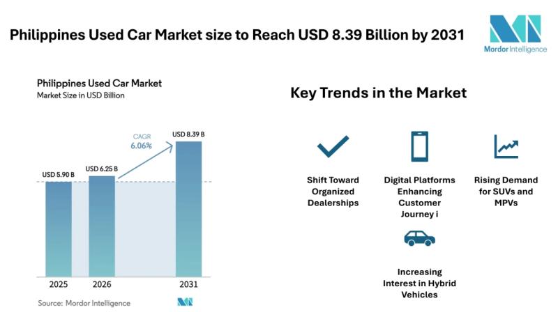 According to Mordor Intelligence, the Philippines used car market size [https://www.mordorintelligence.com/industry-reports/philippines-used-car-market?utm_source=abnewswire] is expected to grow from USD 5.90 billion in 2025 and USD 6.25 billion in 2026 to USD 8.39 billion by 2031, registering a CAGR of 6.06% during the forecast period. This…