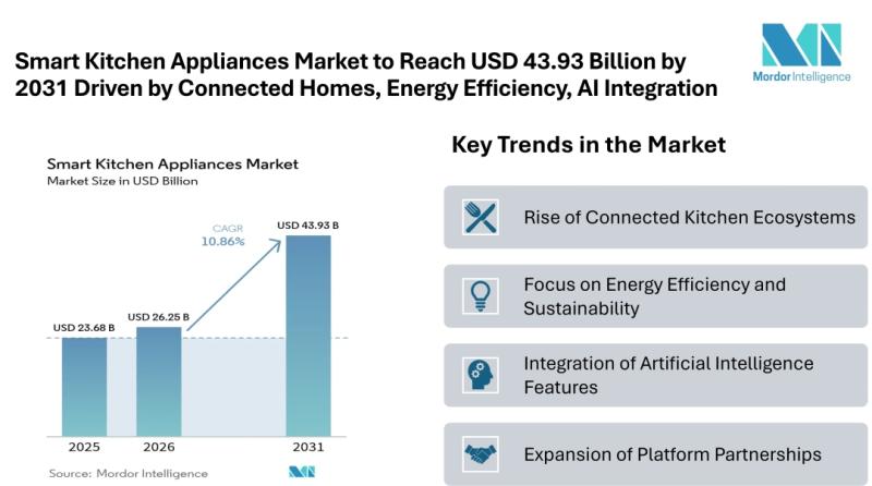 According to Mordor Intelligence, the smart kitchen appliances market size [https://www.mordorintelligence.com/industry-reports/smart-kitchen-appliances-market?utm_soucre=abnewswire] is projected to grow from USD 23.68 billion in 2025 to USD 26.25 billion in 2026, and further reach USD 43.93 billion by 2031, registering a CAGR of 10.86% during the market forecast period (2026-2031). The market is witnessing steady expansion as connected living becomes more common across households…