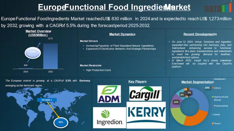 Europe Functional Food Ingredients Market reached US$ 830 million in 2024 and is expected to reach US$ 1,273 million by 2032, growing with a CAGR of 5.5% during the forecast period 2025-2032.