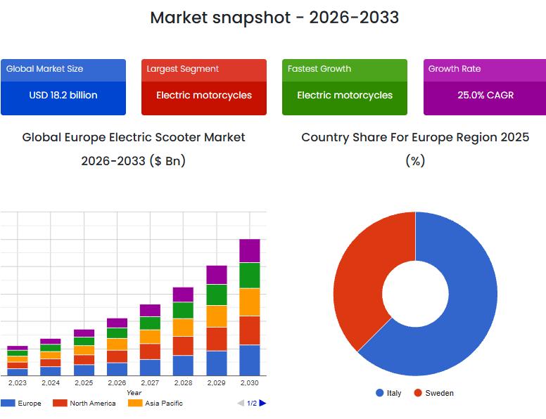 Global demand for electric scooters in Europe is witnessing unprecedented acceleration driven by sustainability goals and urban mobility innovation. According to the latest market intelligence report by SkyQuest Technology, the Europe Electric Scooter Market size was valued at USD 22.75 Billion in 2024 and is poised to grow from USD 28.44 Billion in 2025 to USD 169.5 Billion by 2033, growing at a CAGR of 25% during the forecast period (2026-2033). This rapid growth reflects the region's aggressive push toward reducing carbon emissions and promoting clean transportation alternatives.