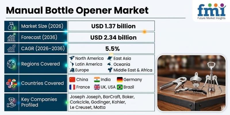 The global manual bottle opener market is witnessing steady growth as consumer lifestyle trends and hospitality sector expansion continue to drive demand. According to the latest analysis, the market is valued at USD 1.37 billion in 2026 and is projected to reach USD 2.34 billion by 2036, expanding at a CAGR of 5.5%. The sector is expected to generate an incremental opportunity of USD 0.97 billion over the forecast period.