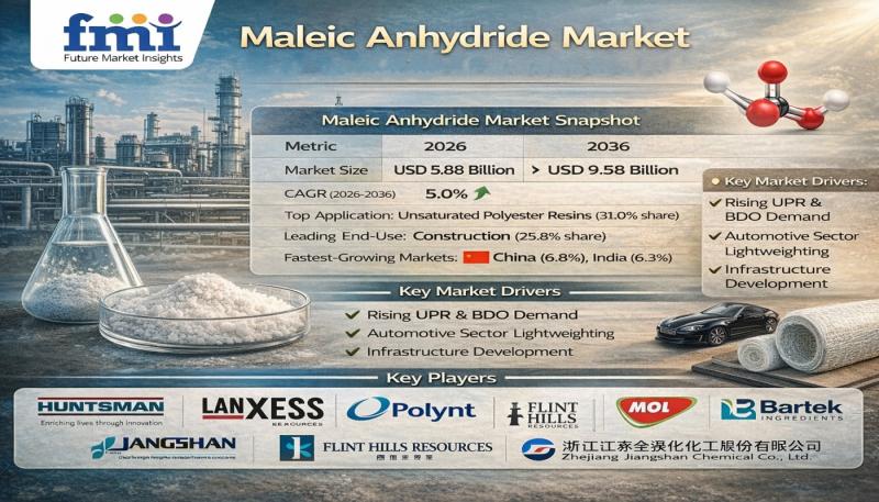 Valued at USD 5.88 billion in 2026, the market is projected to reach USD 9.58 billion by 2036, expanding at a CAGR of 5.0%, supported by rising demand for unsaturated polyester resins and downstream derivatives.