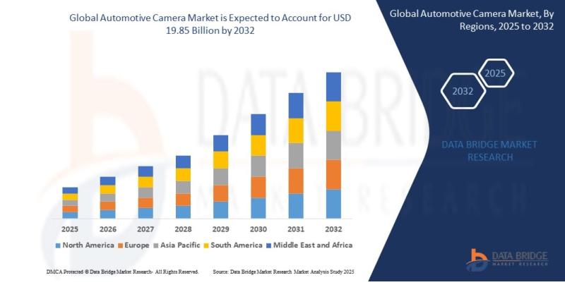 As per Data Bridge Market Research analysis, the Automotive Camera Market was estimated at USD 10.48 billion in 2025. The market is expected to grow from **USD 11.48 billion in 2026 to USD 19.85 billion in 2032, at a CAGR of 9.54% during the forecast period with driven by the rising demand for advanced driver assistance systems (ADAS), increasing vehicle safety regulations, and growing integration of autonomous driving technologies.