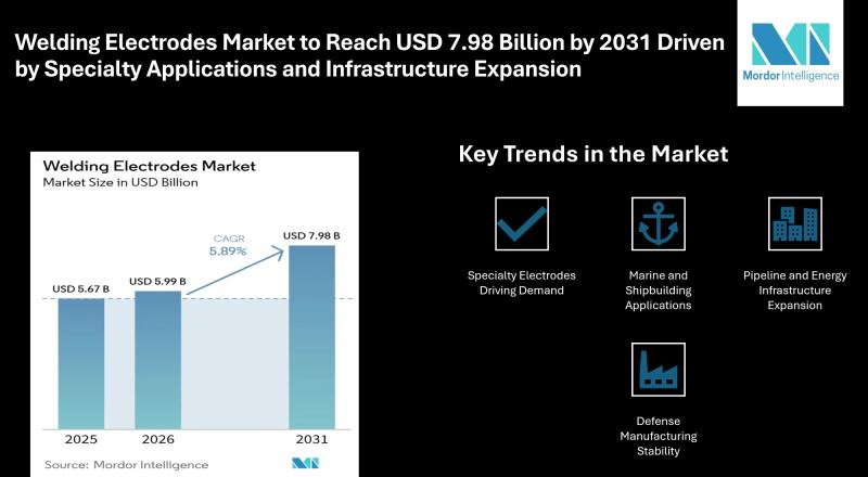 According to Mordor Intelligence analysis, the welding electrodes market size is projected to grow from USD 5.67 billion in 2025 to USD 5.99 billion in 2026, and further reach USD 7.98 billion by 2031, registering a CAGR of 5.89%. This market forecast…