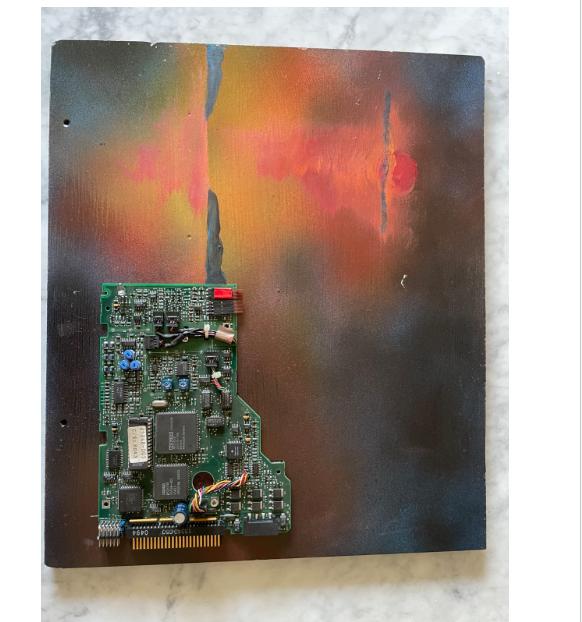It shows a ghostly human silhouette in muted flesh tones. Embedded directly onto the canvas are actual microchips and circuit boards from early calculators and industrial controllers. Not artistic representations. Real technological artifacts that once processed electrical signals, now frozen in thick layers of oil paint.