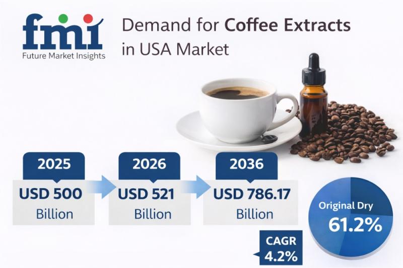 The demand for coffee extracts in the USA is witnessing steady expansion as consumer preferences shift toward premium coffee experiences, convenience formats, and clean-label ingredient sourcing. According to the latest analysis, the market is valued at USD 521 billion in 2026 and is projected to reach USD 786.17 billion by 2036, expanding at a CAGR of 4.2%. The sector is expected to generate an incremental opportunity of USD 265.17 billion over the forecast period.This growth reflects a transformation in coffee consumption patterns, where high-purity extracts and concentrates are increasingly replacing traditional brewing methods across ready-to-drink beverages, food applications, and specialty formulations.