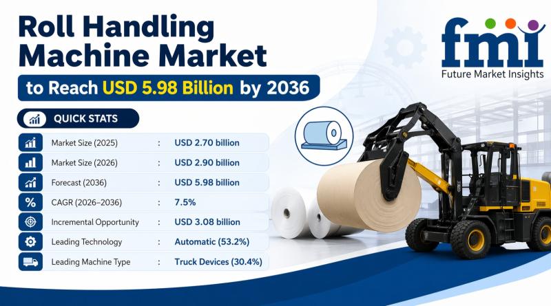 The global roll handling machine market is entering a high-growth phase as manufacturing industries accelerate investments in automation and workplace safety solutions. According to the latest analysis, the market is valued at USD 2.90 billion in 2026 and is projected to reach USD 5.98 billion by 2036, expanding at a CAGR of 7.5%. The sector is expected to generate an incremental opportunity of USD 3.08 billion over the forecast period.