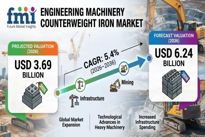 According to the latest analysis by Future Market Insights (FMI), the global engineering machinery counterweight iron market is set for sustained expansion as infrastructure development and industrial mechanization accelerate worldwide. The market is projected to grow from USD 3.69 billion in 2026 to USD 6.24 billion by 2036.