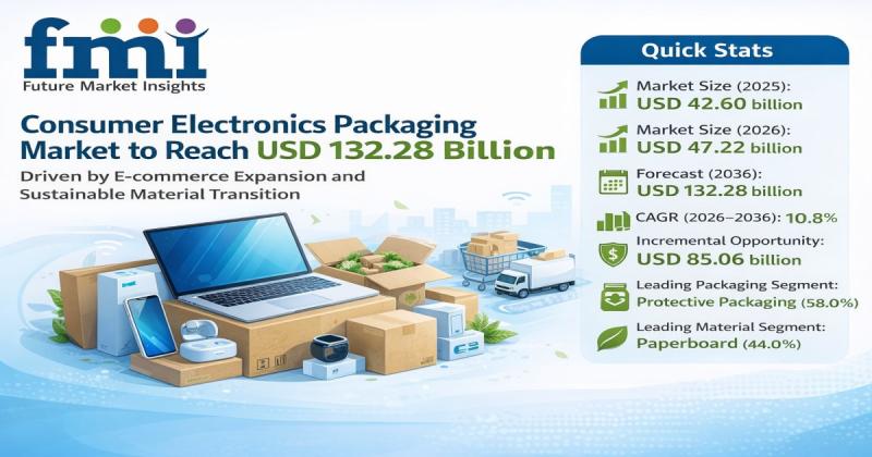 The global consumer electronics packaging market is entering a high-growth phase as device shipments and e-commerce distribution continue to scale globally. According to the latest analysis, the market is valued at USD 47.22 billion in 2026 and is projected to reach USD 132.28 billion by 2036, expanding at a CAGR of 10.8%. The sector is expected to generate an incremental opportunity of USD 85.06 billion over the forecast period.