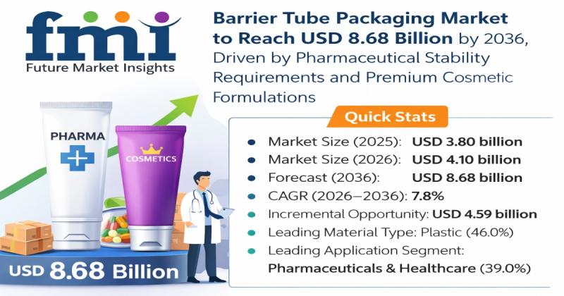 The global barrier tube packaging market is entering a high-growth phase as industries increasingly shift toward advanced packaging solutions that ensure product integrity and extended shelf life. According to the latest analysis, the market is valued at USD 4.10 billion in 2026 and is projected to reach USD 8.68 billion by 2036, expanding at a CAGR of 7.8%. The sector is expected to generate an incremental opportunity of USD 4.59 billion over the forecast period.This growth reflects a structural transformation in packaging demand, where standard tubes are being replaced by high-performance barrier tubes capable of preventing oxygen ingress, moisture transmission, and active ingredient degradation across pharmaceutical, cosmetic, and oral care applications.
