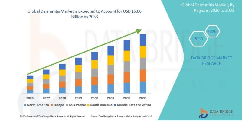As per Data Bridge Market Research analysis, the Dermatitis Market was estimated at USD 8.08 billion in 2025. The market is expected to grow from USD 8.73 billion in 2026 to USD 15.06 billion in 2033, at a CAGR of 8.10% during the forecast period with driven by the rising demand for advanced dermatological treatments, increasing prevalence of skin disorders, and growing awareness regarding early diagnosis and treatment.