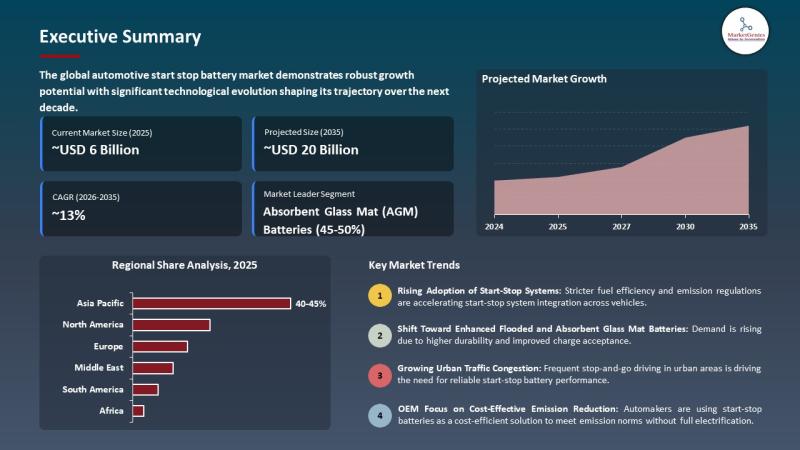 Wilmington, DE, USA, 20th April 2026 - According to MarketGenics, the global automotive start-stop battery market is valued at USD 6.2 billion in 2025 and is projected to reach approximately USD 20.2 billion by 2035, expanding at a CAGR of 12.6% during the forecast period. Growth is primarily driven by stringent fuel-efficiency and emission regulations, rising adoption of start-stop systems in vehicles, and increasing integration of mild hybrid technologies across…
