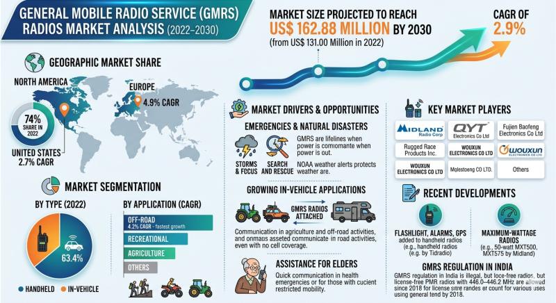 According to a comprehensive market analysis by The Insight Partners, the global General Mobile Radio Service (GMRS) Radios Market is witnessing consistent growth, driven by rising demand for reliable off‐grid communication solutions across recreational, agricultural, and emergency applications. The market, valued at US$ 131 million in 2022, is projected to reach US$ 162.88 million by 2030, registering a compound annual growth rate (CAGR) of 2.9% during the forecast period from 2022 to 2030.Get a sample PDF of the Report: https://www.theinsightpartners.com/sample/TIPRE00029956?utm_source=OpenPR&utm_medium=10935