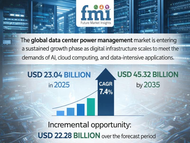 The global data center power management market is entering a sustained growth phase as digital infrastructure scales to meet the demands of AI, cloud computing, and data-intensive applications. According to the latest analysis, the market is valued at USD 23.04 billion in 2025 and is projected to reach USD 45.32 billion by 2035, expanding at a CAGR of 7.4%. The sector is expected to generate an incremental opportunity of USD 22.28 billion over the forecast period.This growth reflects a structural transformation in how data centers manage energy-shifting from traditional hardware-heavy systems to intelligent, software-defined, and sustainability-focused power ecosystems.