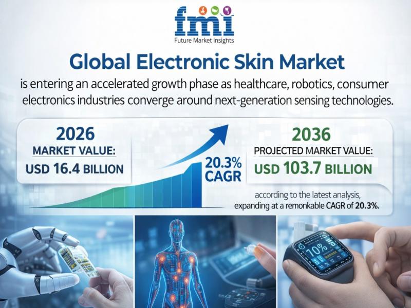 The global electronic skin market is entering an accelerated growth phase as healthcare, robotics, and consumer electronics industries converge around next-generation sensing technologies. According to the latest analysis, the market is valued at USD 16.4 billion in 2026 and is projected to reach USD 103.7 billion by 2036, expanding at a remarkable CAGR of 20.3%.