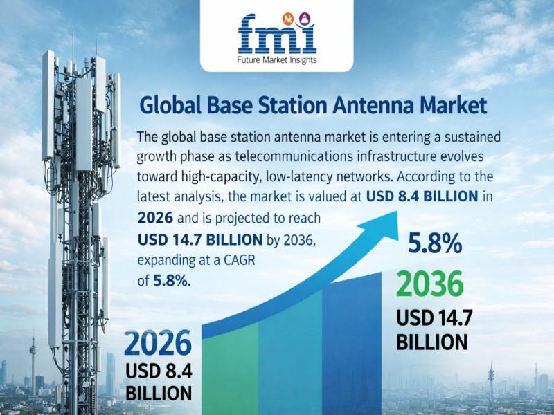 The global base station antenna market is entering a sustained growth phase as telecommunications infrastructure evolves toward high-capacity, low-latency networks. According to the latest analysis, the market is valued at USD 8.4 billion in 2026 and is projected to reach USD 14.7 billion by 2036, expanding at a CAGR of 5.8%.