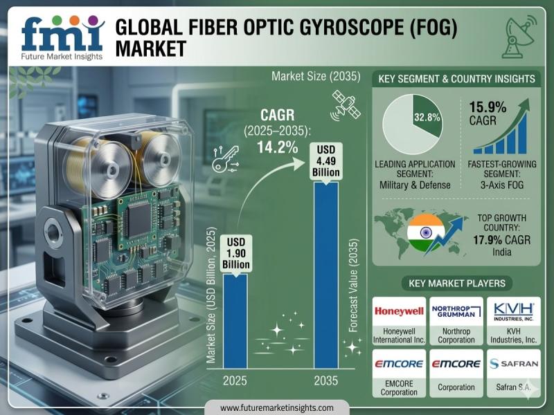 The global fiber optic gyroscope (FOG) market is entering a rapid growth phase as industries increasingly rely on high-precision, drift-free navigation technologies. According to the latest analysis, the market is valued at USD 1.90 billion in 2025 and is projected to reach USD 4.49 billion by 2035, expanding at a strong CAGR of 14.2%.