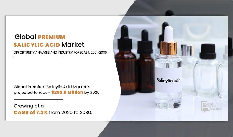 According to the report published by Allied Market Research, the global premium salicylic acid market was estimated at $131.4 million in 2020 and is expected to hit $263.9 million by 2030, registering a CAGR of 7.2% from 2020 to 2030. The report provides an in-depth analysis of the top investment pockets, top winning strategies, drivers & opportunities, market size & estimations, competitive scenario, and wavering market trends.