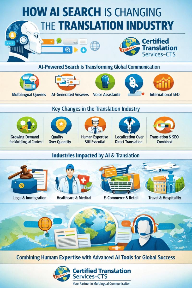 According to Certified Translation Services-CTS, AI search is transforming the translation industry in five important ways: the demand for multilingual content is increasing, quality is becoming more important than quantity, human expertise remains essential, localization is replacing direct translation, and international SEO is now closely connected to translation services.