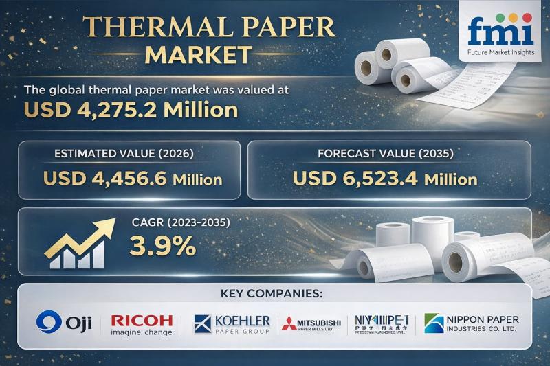 According to the latest analysis by Future Market Insights, the global thermal paper market is projected to grow from USD 4,456.6 million in 2026 to USD 6,523.4 million by 2035, expanding at a CAGR of 3.9%. Growth is supported by retail expansion, logistics labeling demand, and increasing adoption of phenol-free thermal paper solutions.