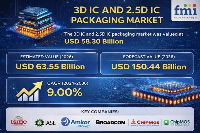 According to the latest analysis by Future Market Insights, the global 3D IC and 2.5D IC packaging market is projected to grow from USD 63.55 billion in 2026 to USD 150.44 billion by 2036, expanding at a CAGR of 9.0%. Growth is being driven by rising demand for AI accelerators, high-bandwidth memory (HBM), and advanced semiconductor integration technologies.