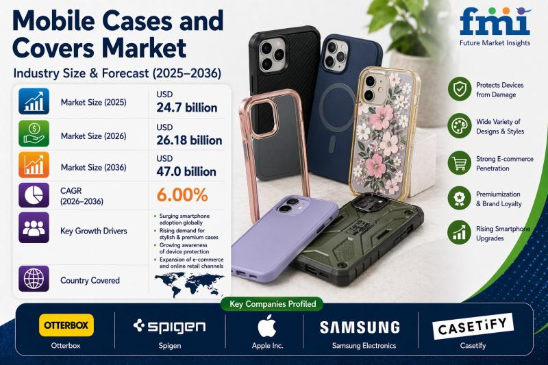 The global Mobile Cases and Covers Market is projected to grow from USD 26.18 billion in 2026 to USD 47.0 billion by 2036, expanding at a CAGR of 6.0%, according to Future Market Insights (FMI). Market expansion is fueled by rising smartphone prices, increasing repair costs, and growing consumer demand for durable yet stylish protective accessories.