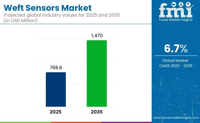 According to the latest analysis by Future Market Insights, the global weft sensors market is poised for steady growth, driven by the rapid evolution of textile manufacturing toward automation, intelligence, and high-efficiency production systems. Valued at USD 768.6 million in 2025, the market is projected to reach USD 1,470 million by 2035, expanding at a CAGR of 6.7% over the forecast period.