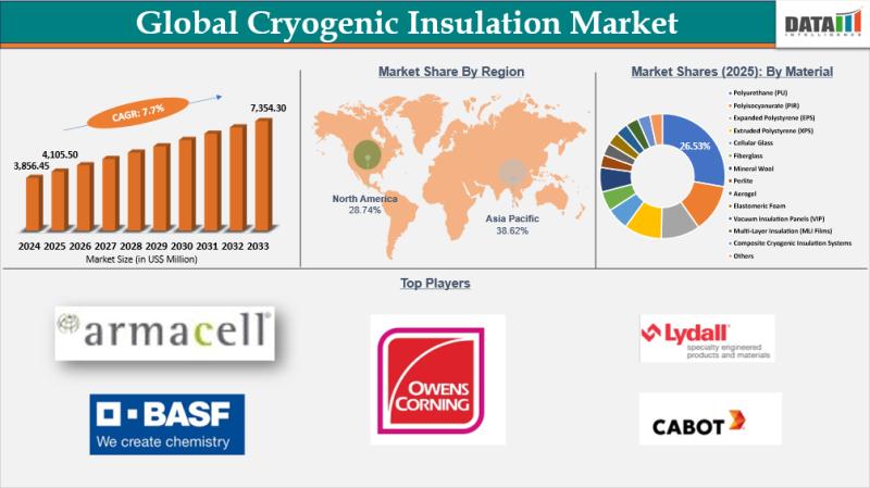According to DMI analysis, the global cryogenic insulation market reached US$ 3,856.45 Million in 2024, rising to US$ 4,105.50 Million in 2025 and is expected to reach US$ 7,354.30 Million by 2033, growing at a strong CAGR of 7.7% during the forecast period from 2026 to 2033.
