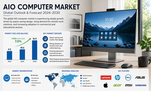 The AIO (All-in-One) Computer Market refers to desktop computer systems that integrate the computer components and display into a single unit, eliminating the need for a separate CPU tower. All-in-one computers are designed to save space, reduce cable clutter, and provide a compact computing solution for homes, offices, educational institutions, and commercial environments. These computers include integrated processors, memory, storage, display, speakers, and connectivity ports within the monitor unit. AIO computers are widely used for office work, education, media consumption, graphic design, and business applications. The market includes consumer AIO computers, business AIO computers, and professional workstation AIO computers. Increasing demand for compact computing devices, remote work setups, and digital learning environments is driving the market growth. Technological advancements such as touchscreen displays, high-resolution monitors, and energy-efficient processors are improving product performance. The market is expected to grow due to increasing adoption of space-saving computing solutions and modern workplace technologies.