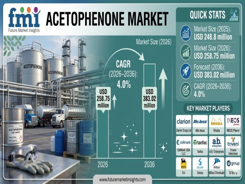 The global acetophenone market is entering a steady-growth trajectory as demand strengthens across flavours & fragrances and pharmaceutical manufacturing sectors. According to the latest analysis, the market is valued at USD 258.75 million in 2026 and is projected to reach USD 383.02 million by 2036, expanding at a CAGR of 4.0%. The sector is expected to generate an incremental opportunity of USD 124.27 million over the forecast period.This growth reflects a structurally stable, application-driven market where acetophenone continues to serve as a critical aromatic intermediate. Its widespread use as a fragrance fixative, pharmaceutical intermediate, and industrial solvent positions it as a key input across multiple regulated and industrial value chains.
