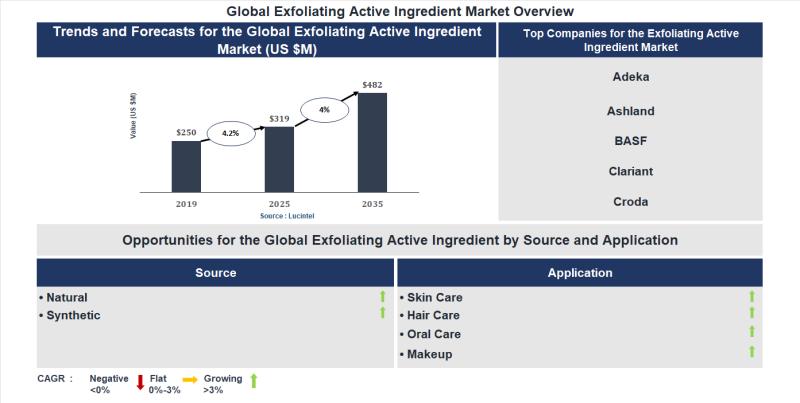 According to a market report by Lucintel, the future of the global exfoliating active ingredient market looks promising with opportunities in the skin care, hair care, oral care, and makeup markets. The global exfoliating active ingredient market is expected to reach an estimated $482 million by 2035 with a CAGR of 4.0% from 2026 to 2035. The major drivers for this market are the rising demand for anti-aging & glowing skin solutions, the increasing influence of social media & beauty trends, and the growing demand for dermatological recommendations for exfoliation treatments.A more than 150-page report to understand trends, opportunity and forecast in exfoliating active ingredient market to 2035 by source (natural and synthetic), application (skin care, hair care, oral care, and makeup), and region (North America, Europe, Asia Pacific, and the Rest of the World).
