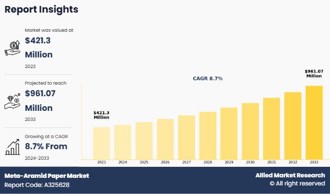 Allied Market Research published a report, titled, "Meta-Aramid Paper Market by Application (Aerospace and Defense, Electronics and Electrical, Automotive, Composites, Industrial Protection, and Others): Global Opportunity Analysis and Industry Forecast, 2024-2033". According to the report, the "meta-aramid paper market" was valued at $421.3 million in 2023, and is estimated to reach $961.07 million by 2033, growing at a CAGR of 8.7% from 2024 to 2033.