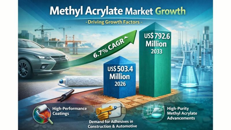 The global methyl acrylate market is witnessing steady expansion, fueled by the rising need for high-performance materials across industries such as construction, automotive, and packaging. According to the latest study by Persistence Market Research, the market is projected to be valued at US$503.4 million in 2026 and is expected to reach US$792.6 million by 2033, growing at a CAGR of 6.7% during the forecast period. This growth trajectory is strongly supported by the increasing adoption of advanced coatings, growing use of adhesives, and continuous improvements in high-purity methyl acrylate production technologies.Methyl acrylate, a key chemical intermediate, plays a vital role in the production of resins, coatings, adhesives, and specialty polymers. Its versatility and compatibility with multiple industrial applications make it an essential component in modern manufacturing processes. As industries increasingly prioritize durability, flexibility, and performance in materials, the demand for methyl acrylate is expected to grow steadily across both developed and emerging economies.