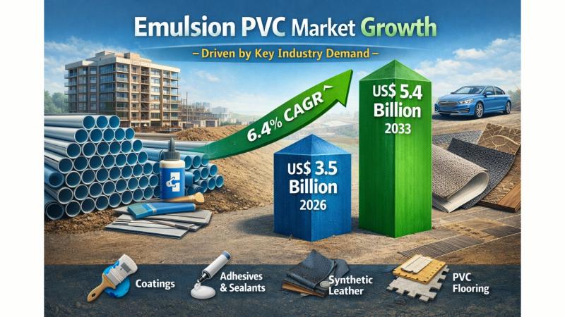 The global Emulsion PVC Market is gaining steady momentum as industries increasingly demand versatile, durable, and cost-effective polymer solutions. According to the latest study by Persistence Market Research, the market is projected to be valued at US$3.5 billion in 2026 and is expected to reach US$5.4 billion by 2033, expanding at a CAGR of 6.4% during the forecast period. This growth is largely fueled by rising applications in construction and…