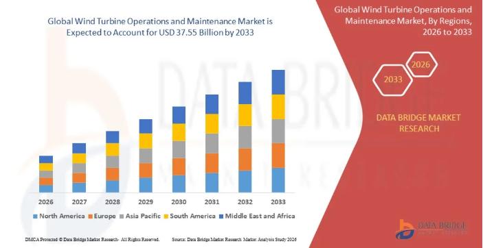 As per Data Bridge Market Research analysis, the Wind Turbine Operations and Maintenance Market was estimated at USD 15.94 billion in 2025. The market is expected to grow from USD 17.74 billion in 2026 to USD 37.55 billion in 2033, at a CAGR of 11.30% during the forecast period (2026-2033), driven by the rising demand for renewable energy generation, increasing global wind capacity installations, and advancements in predictive maintenance technologies.