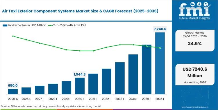 According to the latest analysis by Future Market Insights, the global air taxi exterior component systems market is entering a hyper-growth phase as aerospace manufacturers transition from prototype validation to full-scale commercial production of electric vertical takeoff and landing (eVTOL) aircraft. The market is valued at USD 650.0 million in 2026 and is projected to reach USD 5,800.0 million by 2036, expanding at a CAGR of 24.5%. The sector is expected to generate an incremental opportunity of USD 5,150.0 million over the forecast period.This growth reflects a structural transformation in aerospace manufacturing, where lightweight composite-based exterior systems are becoming critical for enabling efficient, safe, and commercially viable urban air mobility operations.