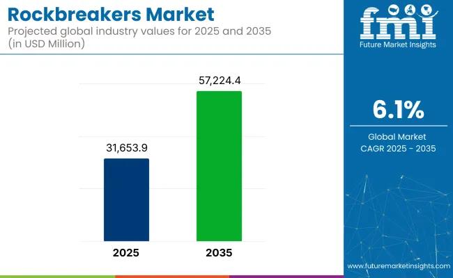 According to the latest analysis by Future Market Insights, the global rockbreakers market is entering a new era of intelligent, high-efficiency excavation, with demand accelerating across mining, quarrying, construction, and infrastructure sectors. According to the latest industry outlook, the market is projected to grow from USD 31,653.9 million in 2025 to USD 57,224.4 million by 2035, registering a steady CAGR of 6.1%.
