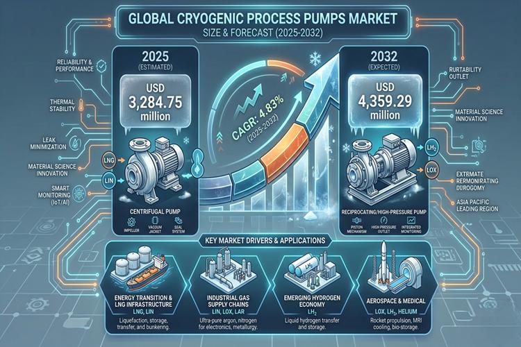 The global Cryogenic Process Pumps Market size was estimated at USD 3,284.75 million in 2025 and is expected to reach USD 4,359.29 million by 2032, growing at a CAGR of 4.83% from 2025 to 2032. The market continues to evolve as industries increasingly depend on ultra-low temperature fluid handling systems for energy, industrial gas, and chemical applications. Cryogenic pumps play a critical role in transporting liquefied gases…