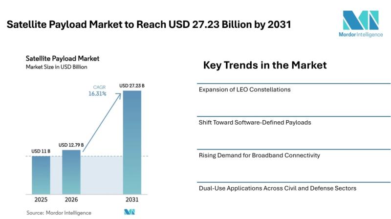 According to Mordor Intelligence, the satellite payload market size is estimated at USD 12.79 billion in 2026, growing from USD 11.00 billion in 2025 and projected to reach USD 27.23 billion by 2031, expanding at a CAGR of 16.31% during the forecast period. This strong…