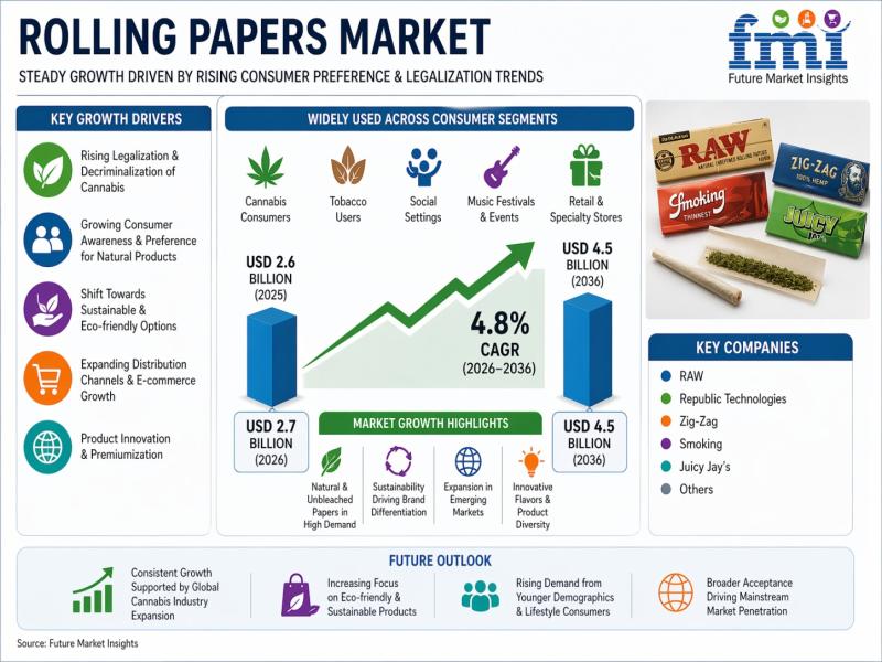 According to Future Market Insights (FMI), the global rolling papers market is projected to grow from USD 2.7 billion in 2026 to USD 4.5 billion by 2036, registering a CAGR of 4.8%. Growth is being driven by legalization trends, rising demand for pre-rolled formats, and increasing preference for organic and unbleached materials.The market is transitioning from traditional booklet-based consumption to automated, pre-rolled cone formats, especially in legalized recreational markets.