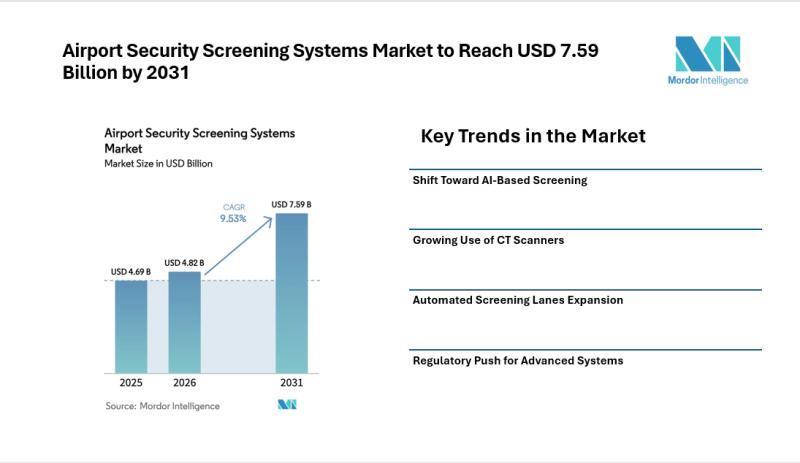 According to Mordor Intelligence, the airport security screening systems market size is projected to grow from USD 4.69 billion in 2025 to USD 4.82 billion in 2026 and is expected to reach USD 7.59 billion by 2031, registering a CAGR of 9.53% during the forecast period. This steady market growth reflects how airports are responding to rising passenger traffic while working within space limitations…