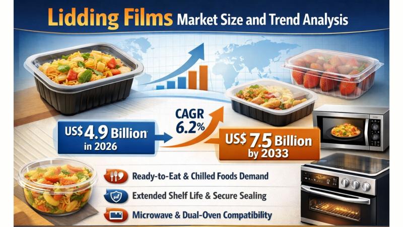 The global Lidding Films Market is witnessing consistent growth, fueled by rapid changes in food consumption patterns and advancements in packaging technologies. According to the latest study by Persistence Market Research, the market is expected to be valued at US$ 4.9 billion in 2026 and is projected to reach US$ 7.5 billion by 2033, expanding at a CAGR of 6.2% during the forecast period. The increasing popularity of ready-to-eat meals, chilled food products, and convenience packaging solutions is playing a pivotal role in driving demand for lidding films worldwide. These films are essential in ensuring product safety, extending shelf life, and maintaining food quality while offering compatibility with microwave and dual-oven applications.Lidding films are widely used in food packaging formats such as trays, cups, jars, and pouches, offering excellent sealing, barrier protection, and ease of use. As consumer lifestyles continue to evolve toward convenience and on-the-go consumption, the demand for innovative and high-performance packaging materials is expected to surge. Below are key trends shaping the future of the lidding films market.