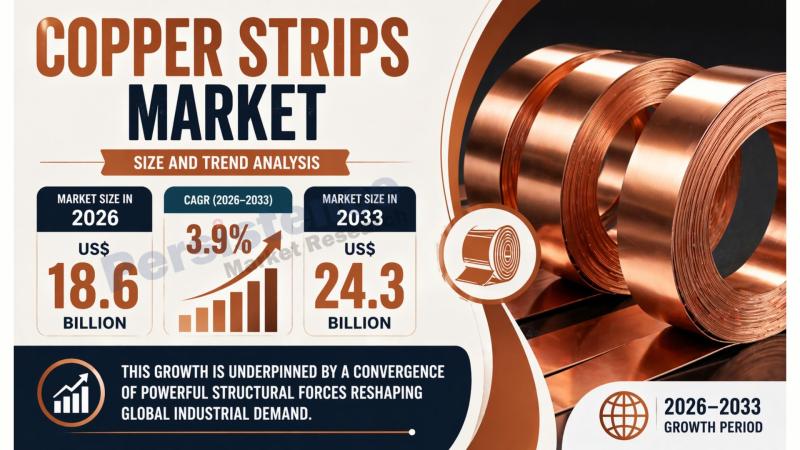 The global Copper Strips Market is experiencing steady growth, supported by a combination of industrial expansion, electrification, and infrastructure development across emerging and developed economies. According to the latest study by Persistence Market Research, the market is valued at US$ 18.6 billion in 2026 and is projected to reach US$ 24.3 billion by 2033, growing at a CAGR of 3.9% between 2026 and 2033. This growth is underpinned by a…