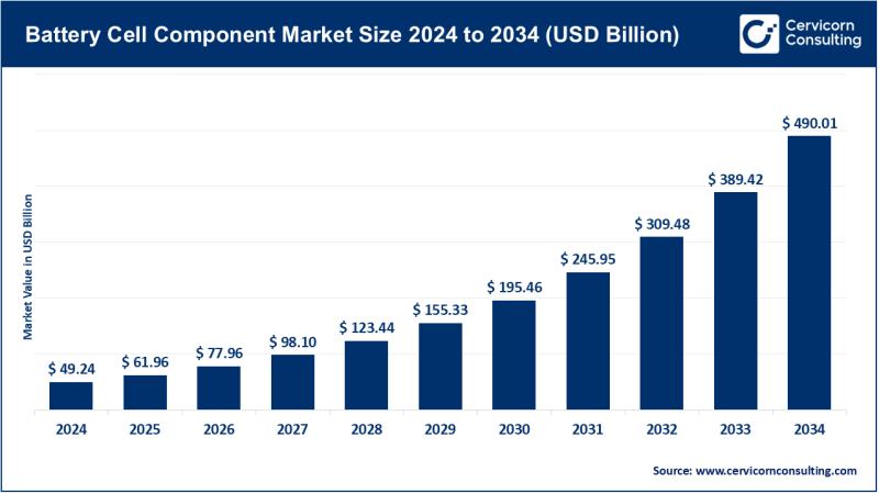 Battery Cell Component Market to Reach USD 490.01 Billion by 2034 at 25.83% CAGR