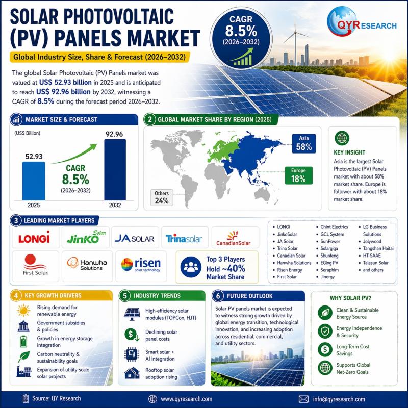 According to a newly published report by QY Research, the global Solar Photovoltaic (PV) Panels Market 2026 delivers a comprehensive and data-driven analysis designed to enhance business decision-making and unlock high-growth opportunities across industries.This study provides deep insights into market dynamics, competitive landscape, and future growth potential, helping organizations strengthen their strategic positioning and maximize return on investment. As a customized and client-focused research solution, the report leverages advanced methodologies including primary interviews, surveys, and a combination of qualitative and quantitative analysis to ensure accuracy and relevance.