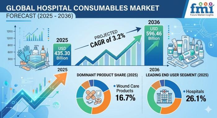 NEWARK, Del., USA | April 23, 2026/ According to latest insights by Future Market Insights, the global hospital consumables market is entering a steady growth phase as healthcare systems prioritize infection prevention, procedural efficiency, and cost-effective procurement strategies. According to the latest analysis, the market is valued at USD 435.30 billion in 2026 and is projected to reach USD 596.46 billion by 2036, expanding at a CAGR of 3.20%. The…