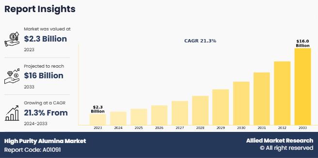 Allied Market Research published a report, titled, "High Purity Alumina Market by Type (2N, 3N, and 4N+), and Application (LED, Semiconductor, Li-ion Batteries, Sapphire Glass, and Others): Global Opportunity Analysis and Industry Forecast, 2024-2033". According to the report, the "high purity alumina market" was valued at $2.3 billion in 2023, and is estimated to reach $16 billion by 2033, growing at a CAGR of 21.3% from 2024 to 2033. …